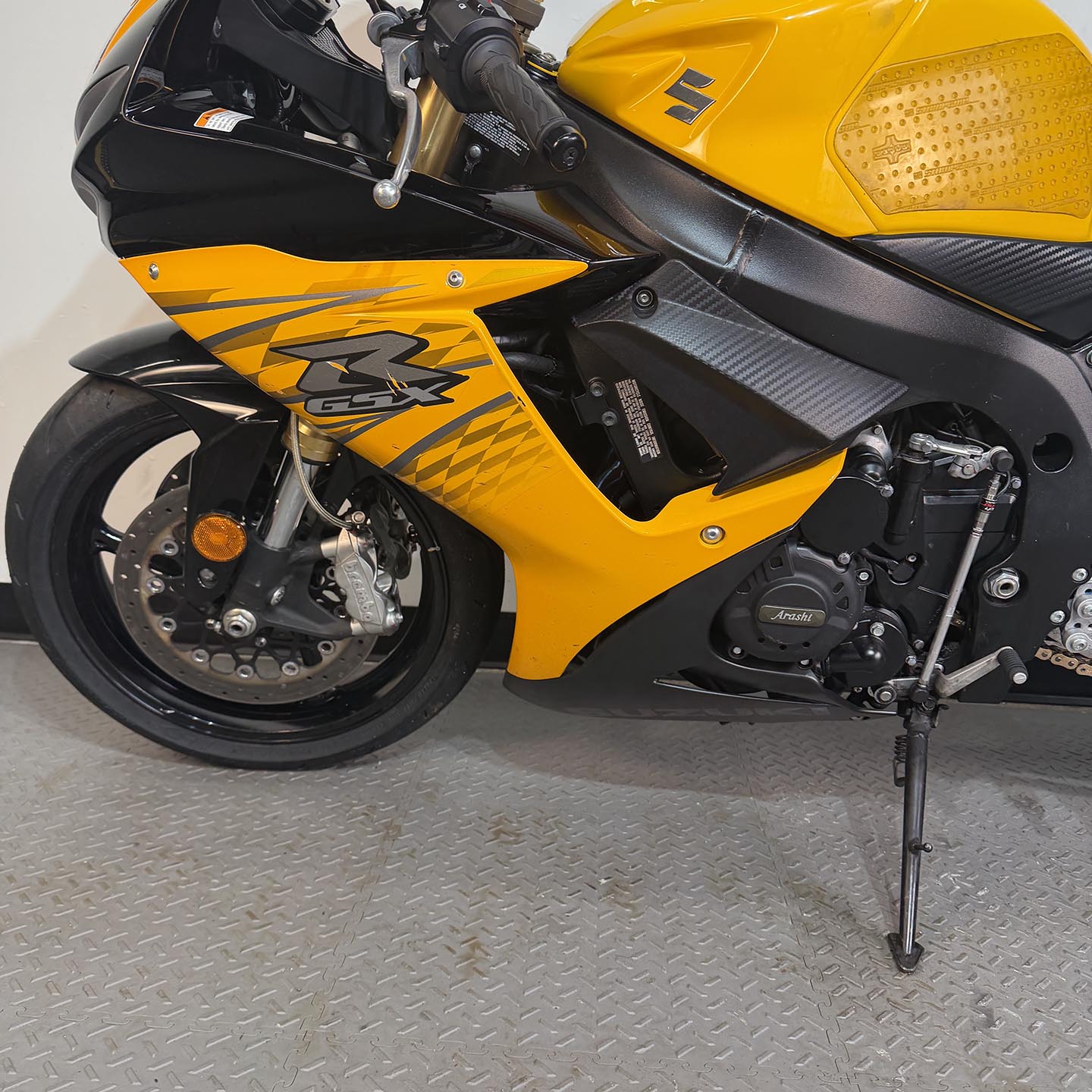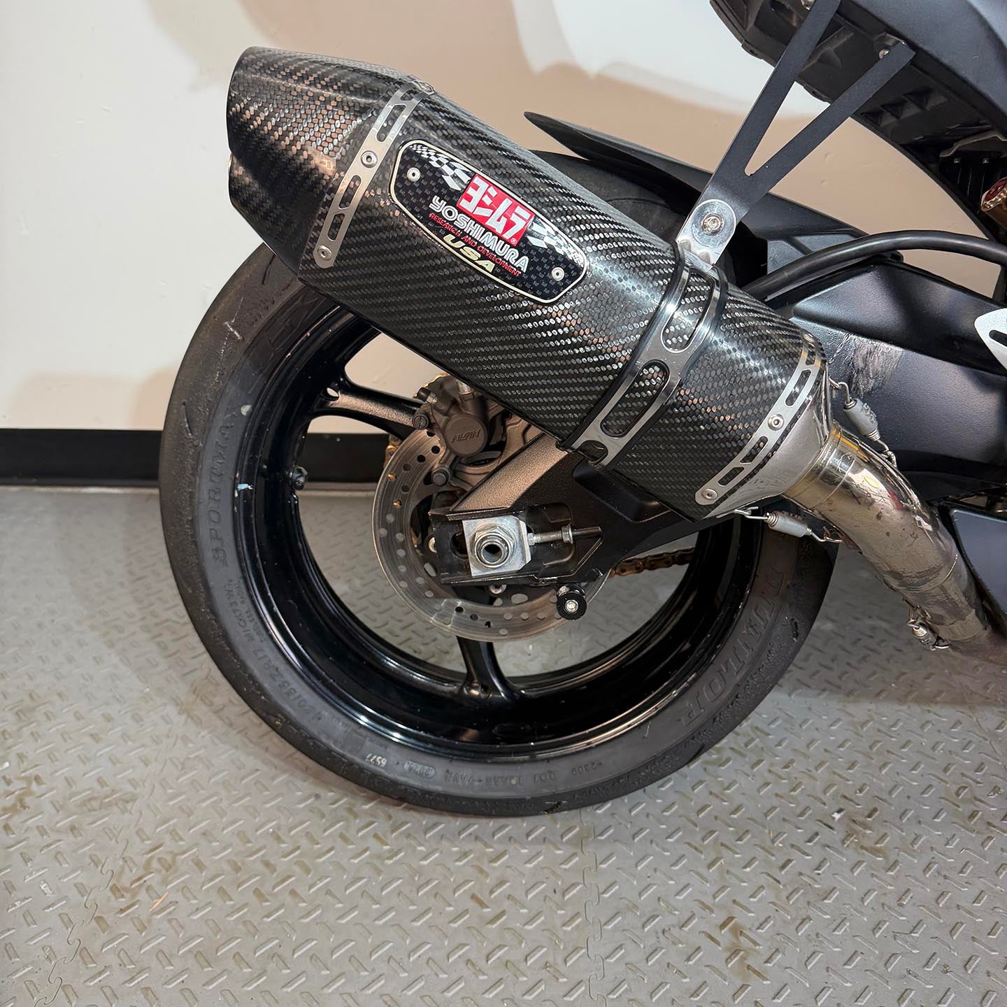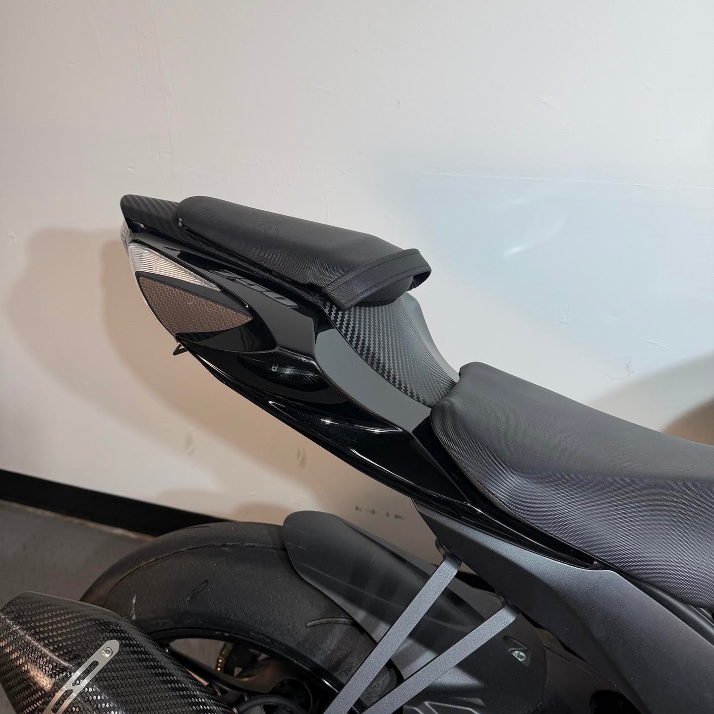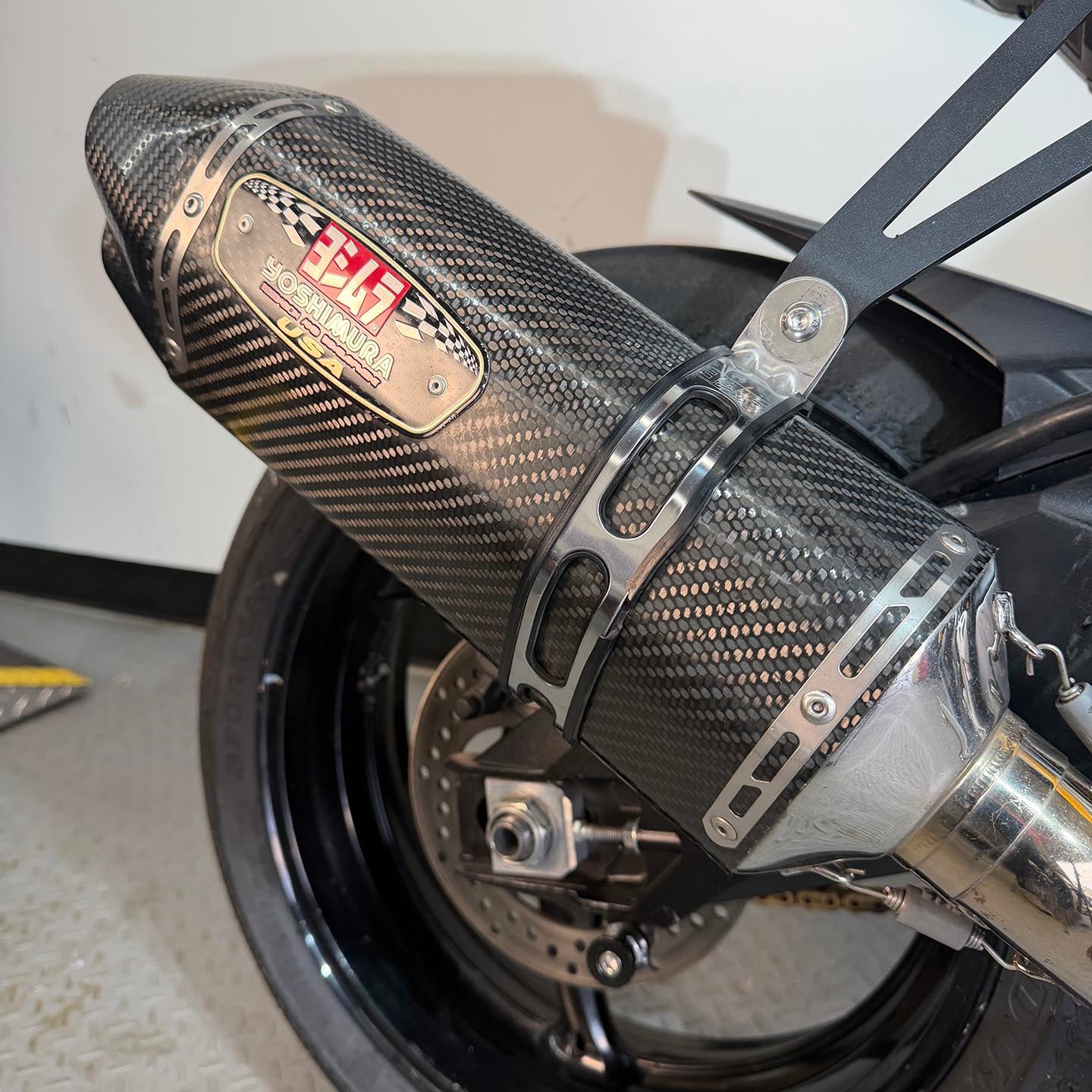 This specific motorcycle has a full Yoshimura exhaust installed. It has a refreshed ECU with an electronic quickshifter. A Brembo RCS19 master cylinder has been installed along with steel braided brake lines.