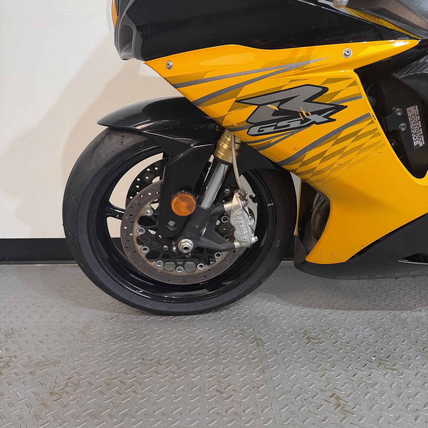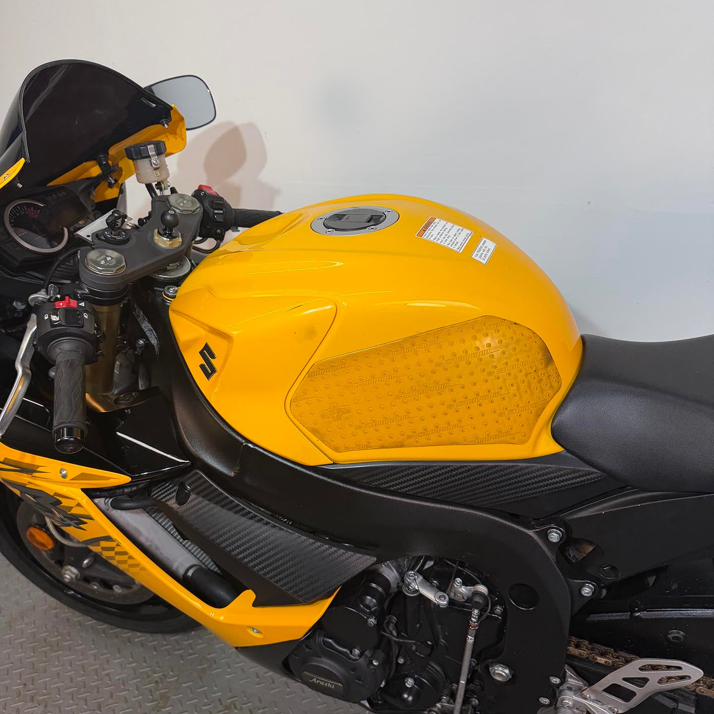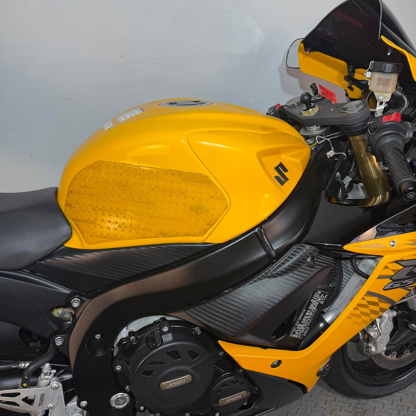This specific motorcycle has a full Yoshimura exhaust installed. It has a refreshed ECU with an electronic quickshifter. A Brembo RCS19 master cylinder has been installed along with steel braided brake lines.