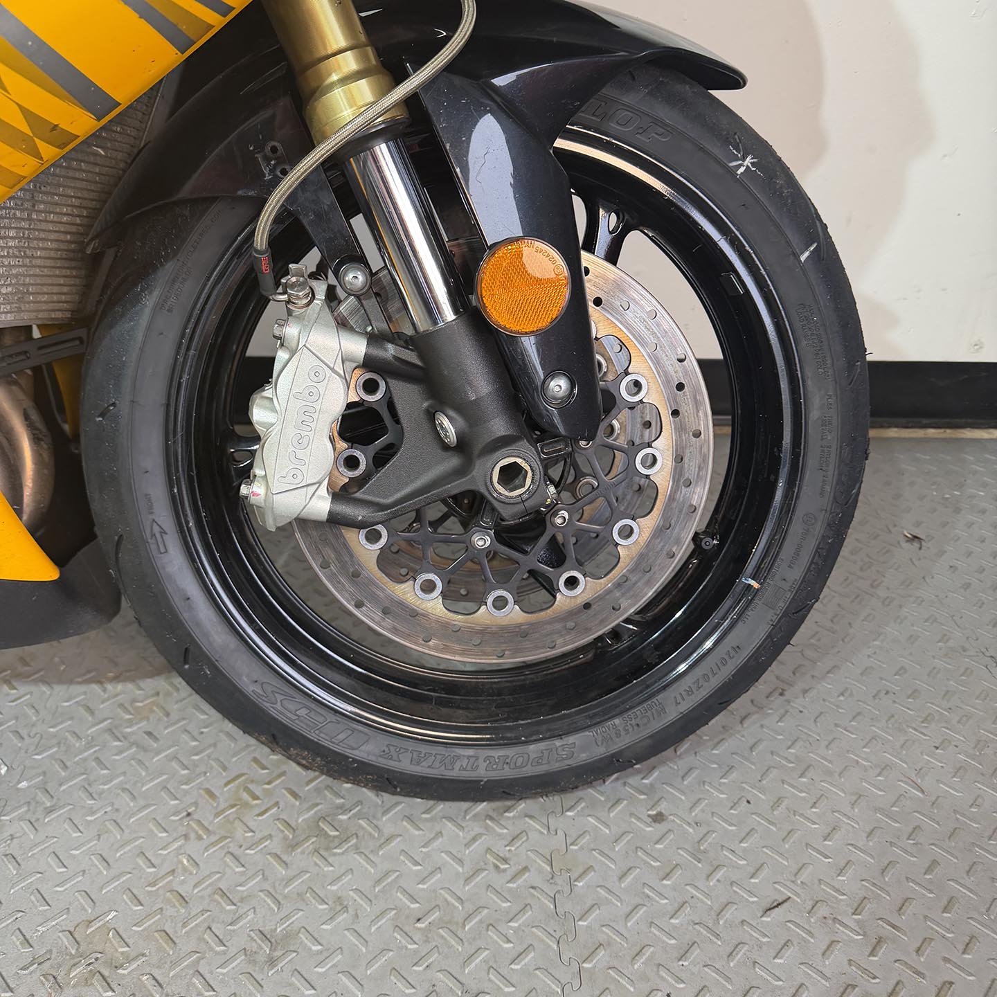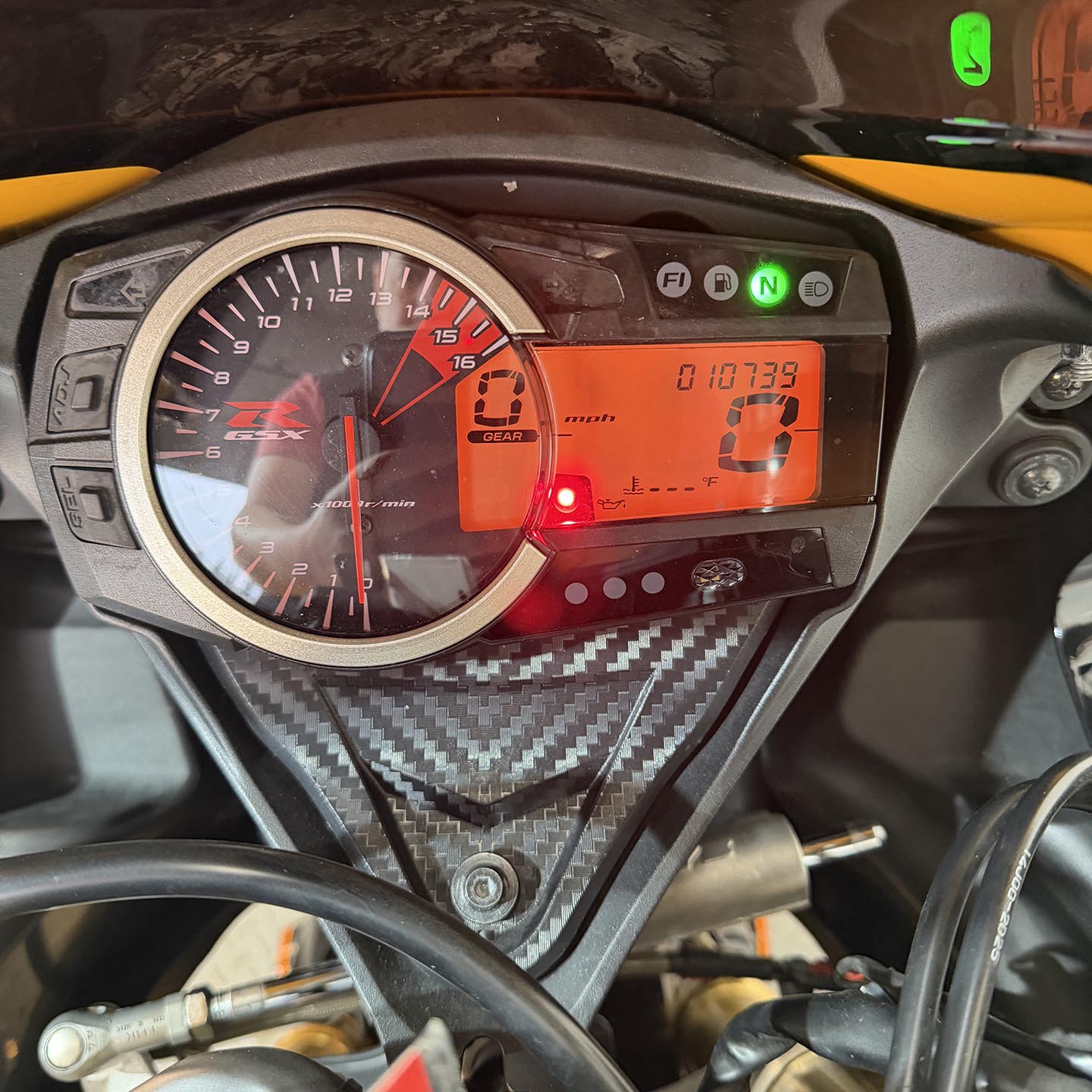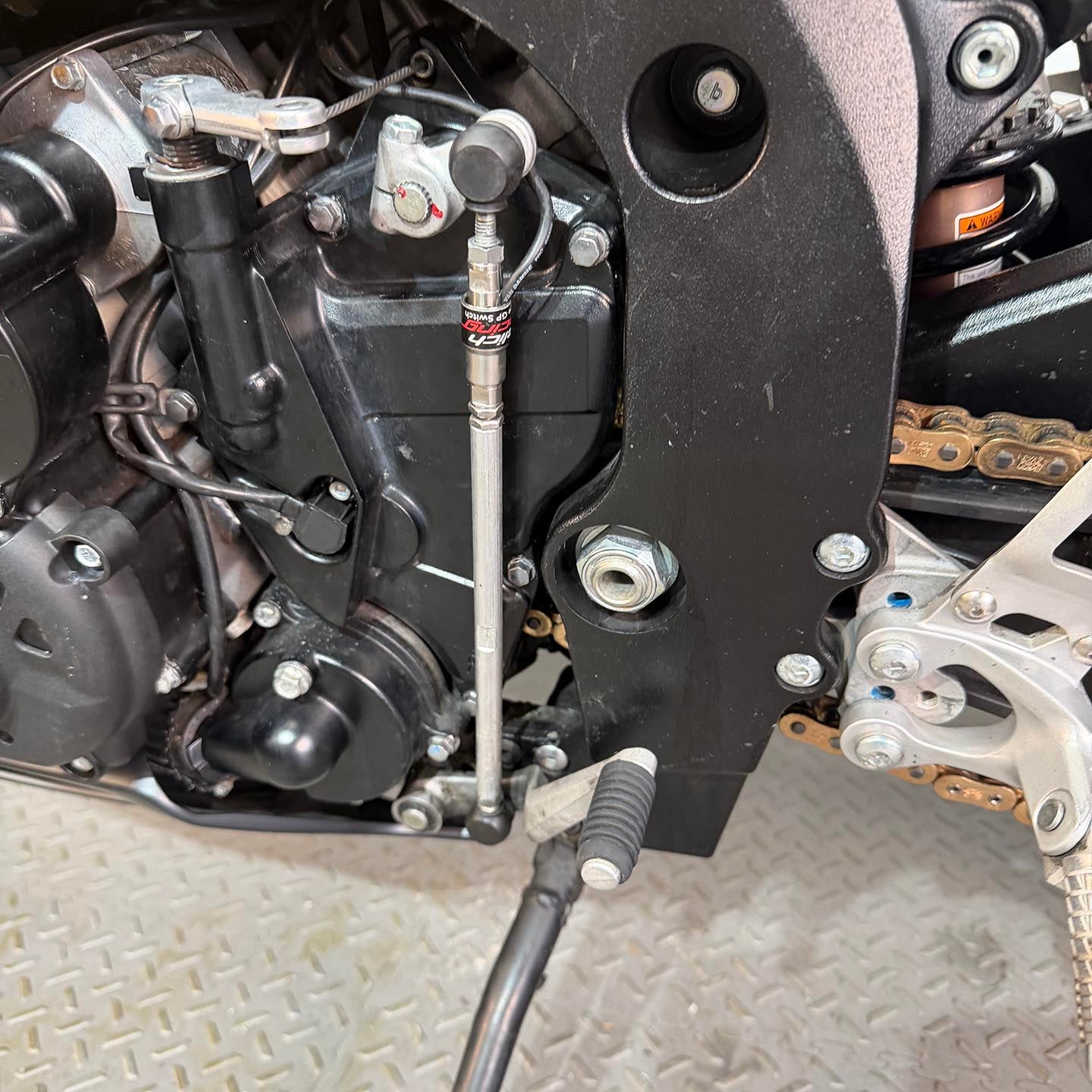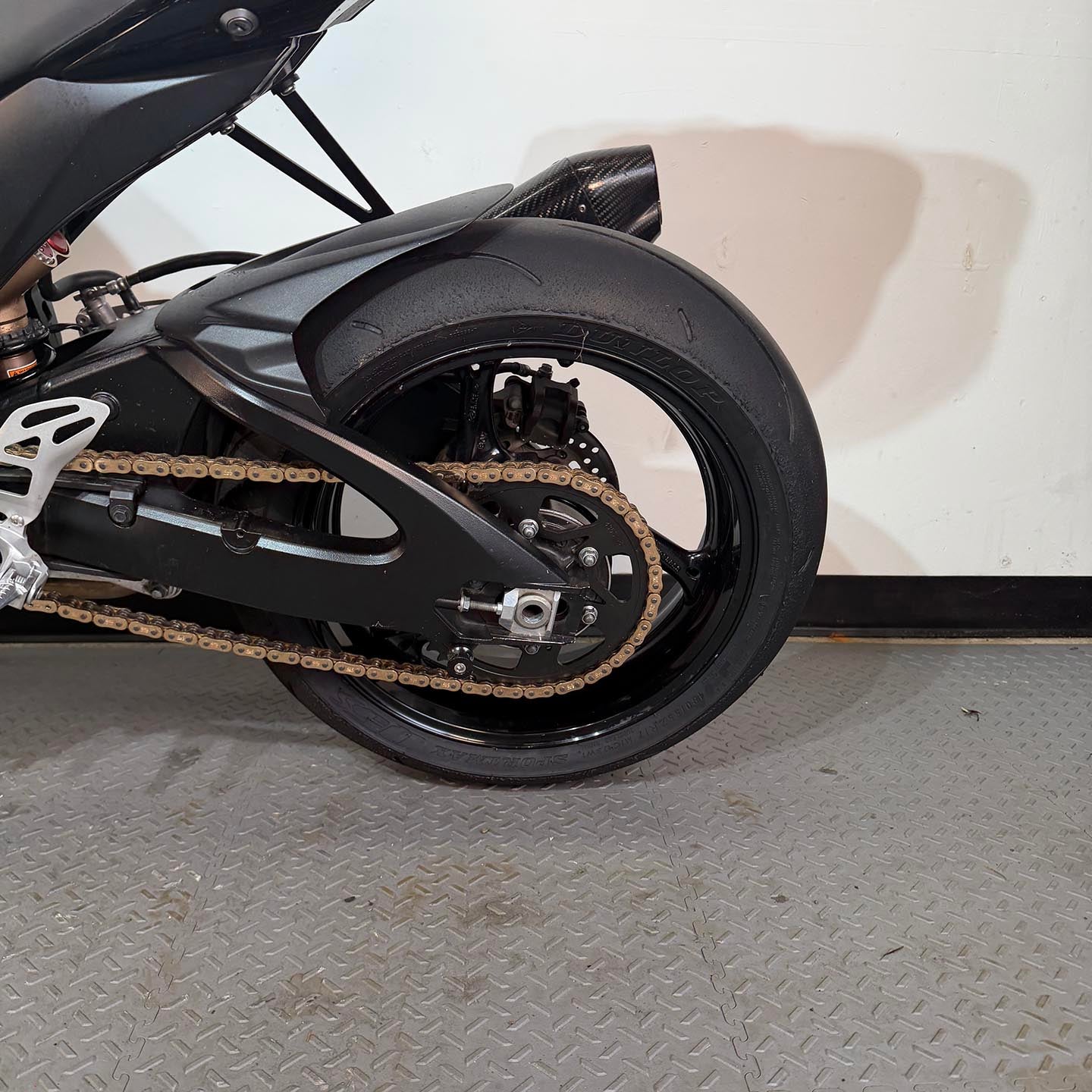 This specific motorcycle has a full Yoshimura exhaust installed. It has a refreshed ECU with an electronic quickshifter. A Brembo RCS19 master cylinder has been installed along with steel braided brake lines.
