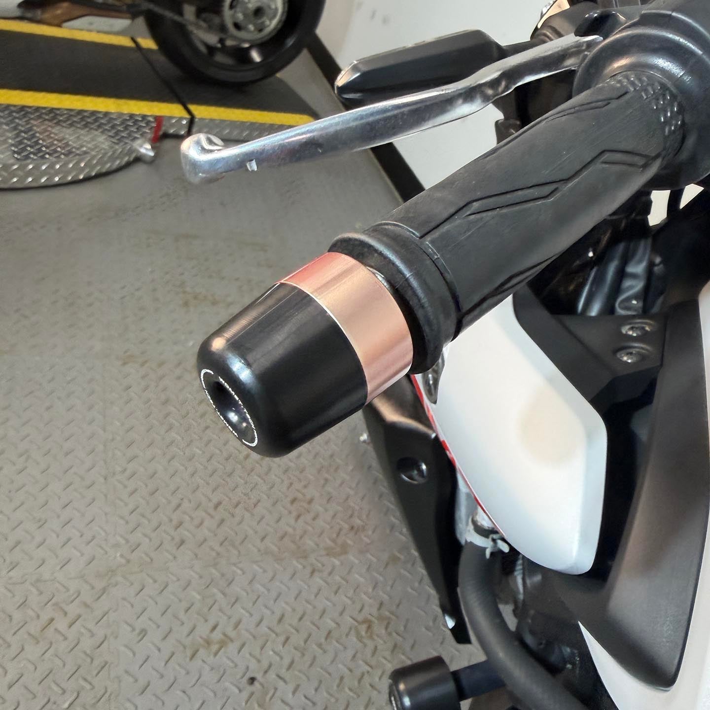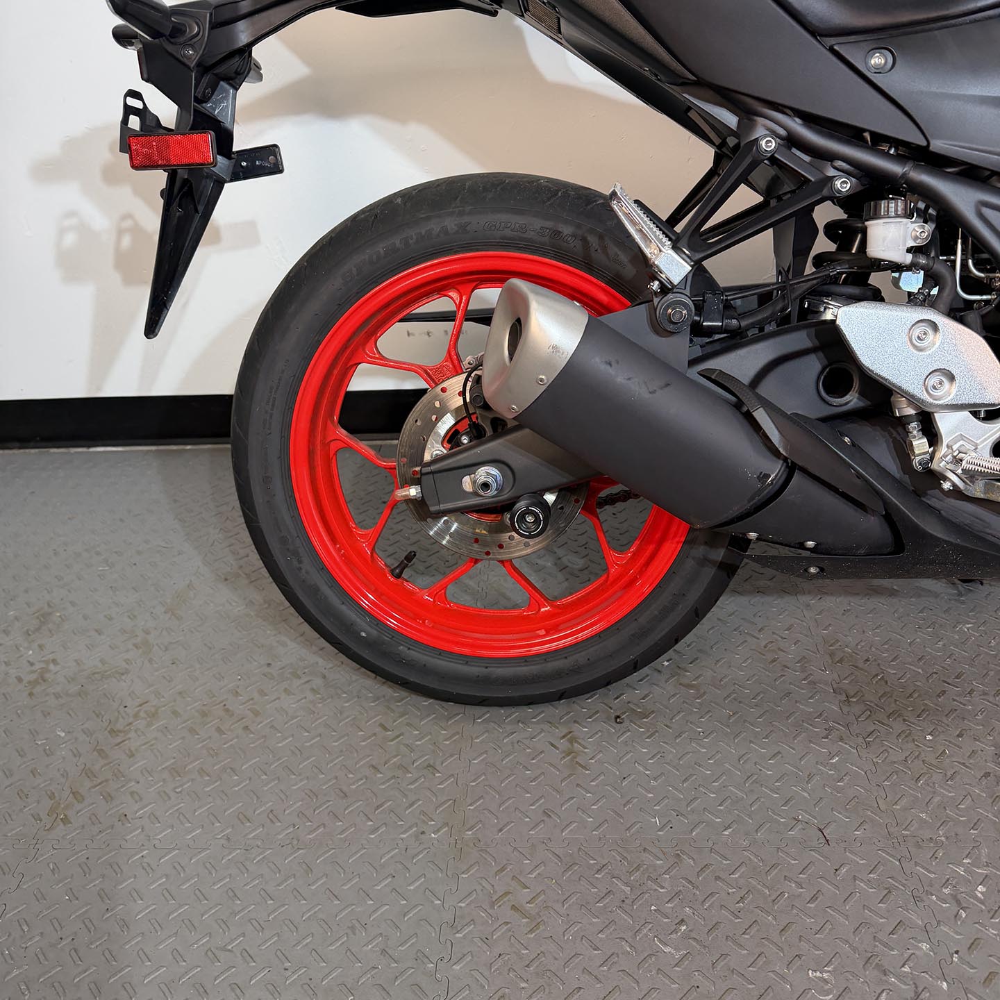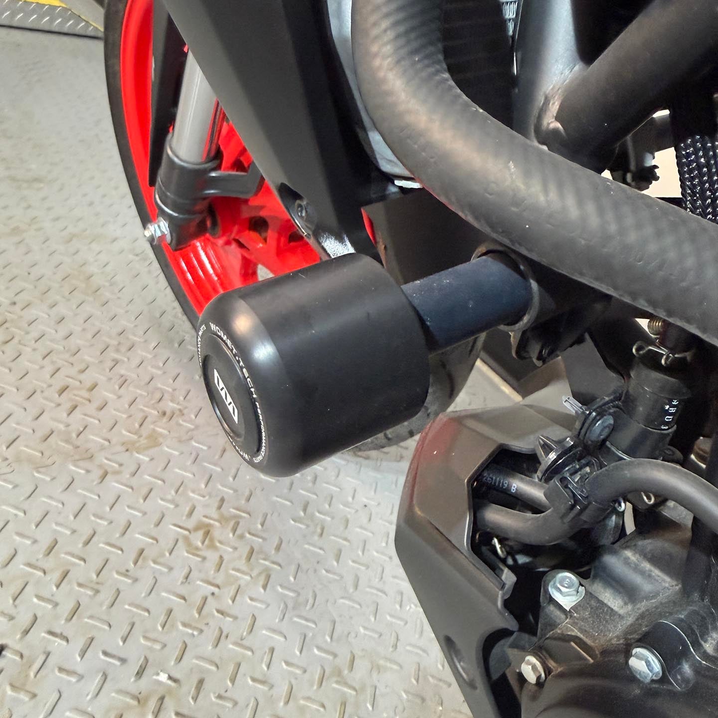 This specific motorcycle has frame sliders and rear axle sliders installed.