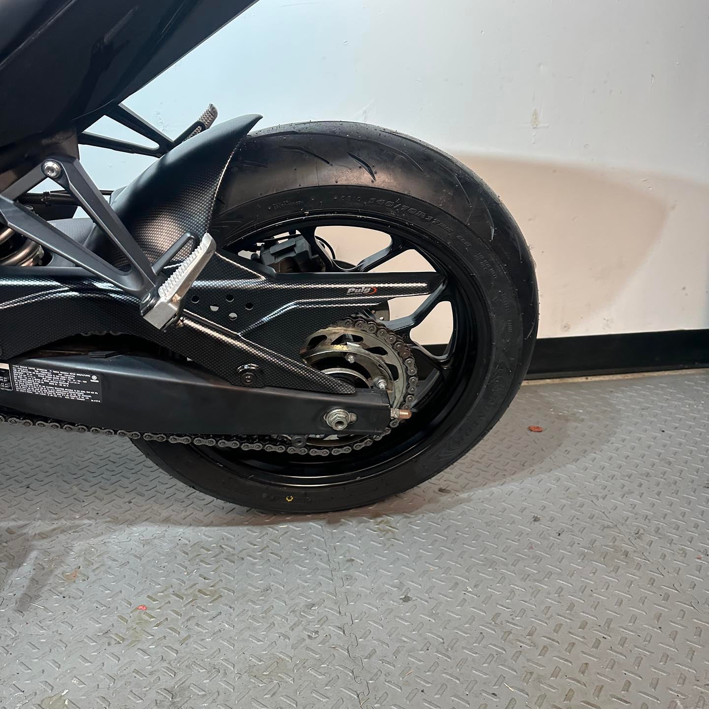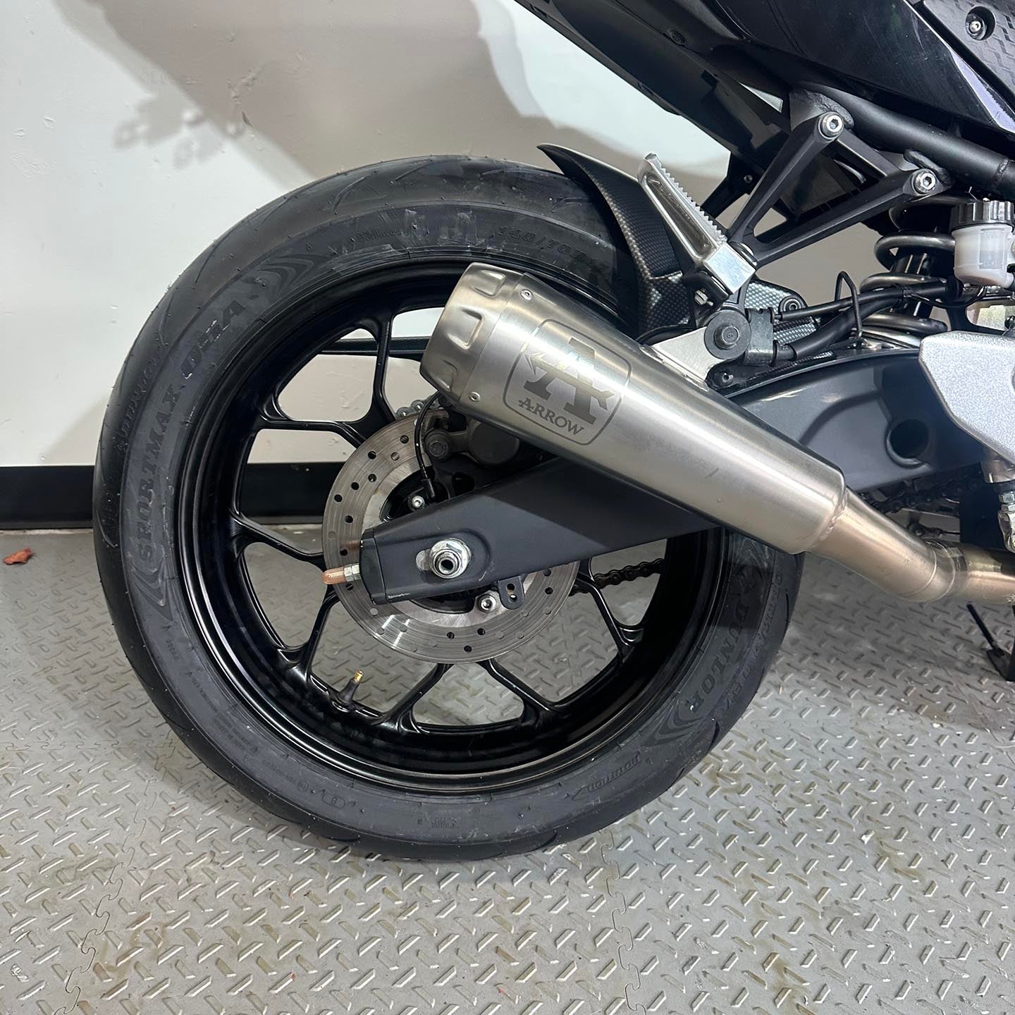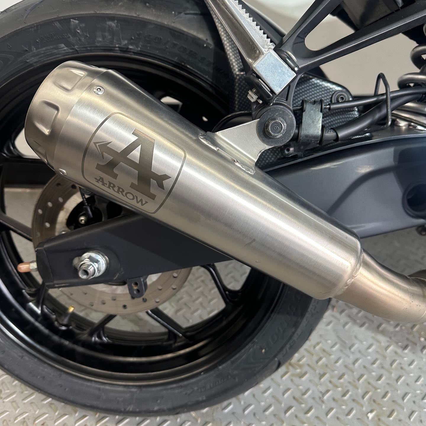 This specific motorcycle has a full Arrow exhaust system installed with refreshed ECU. A brand new set of Dunlop Q5A tires have been installed, very nice. A TST Industries integrated tail light and fender eliminator kit have been installed. Flush mount front turn signals from TST have also been fitted. A quad lock phone mount with vibration damping is also installed.