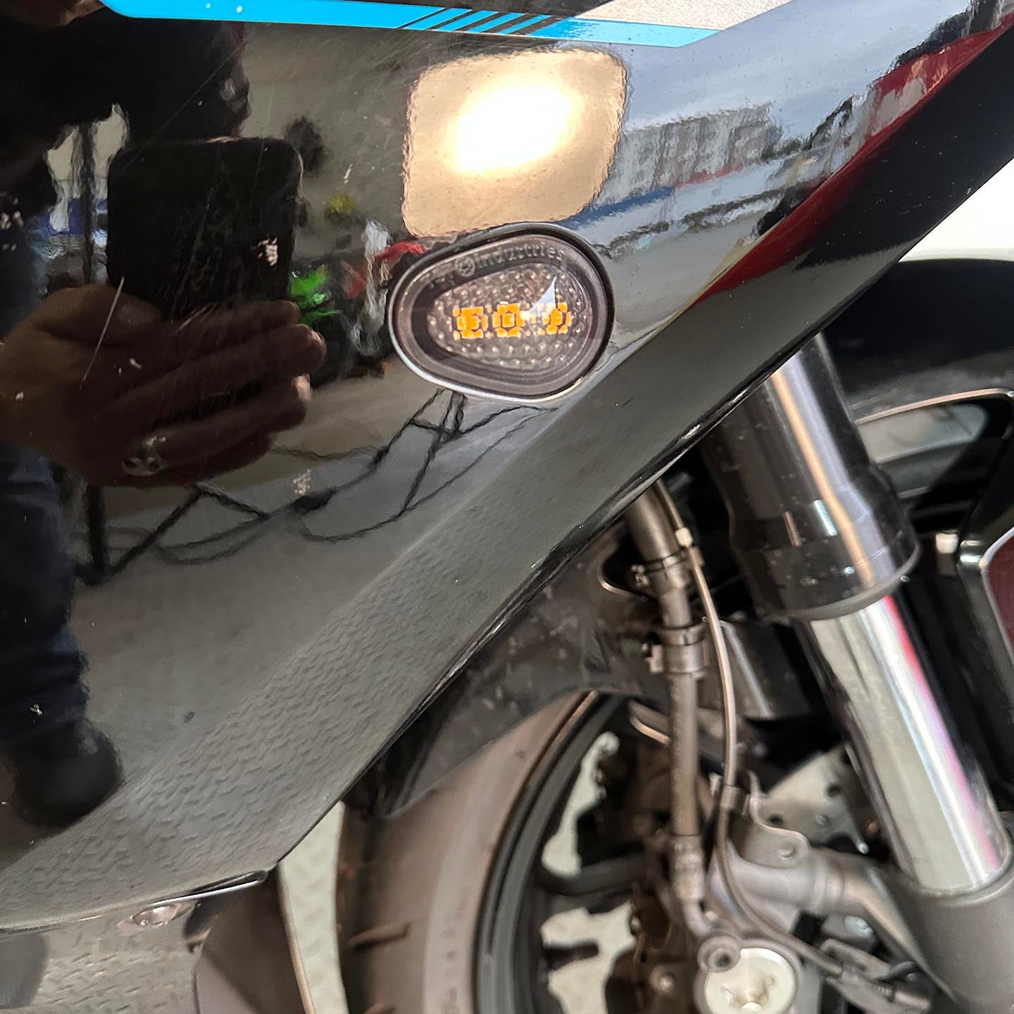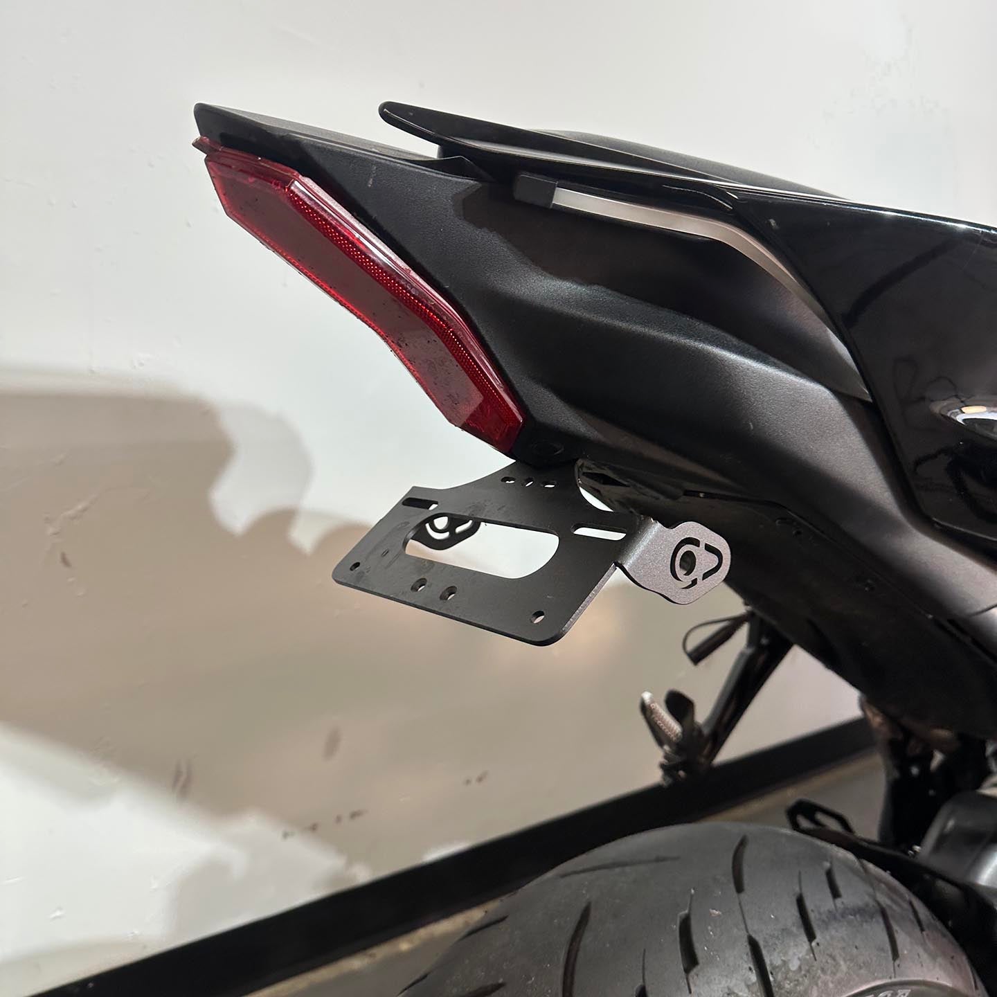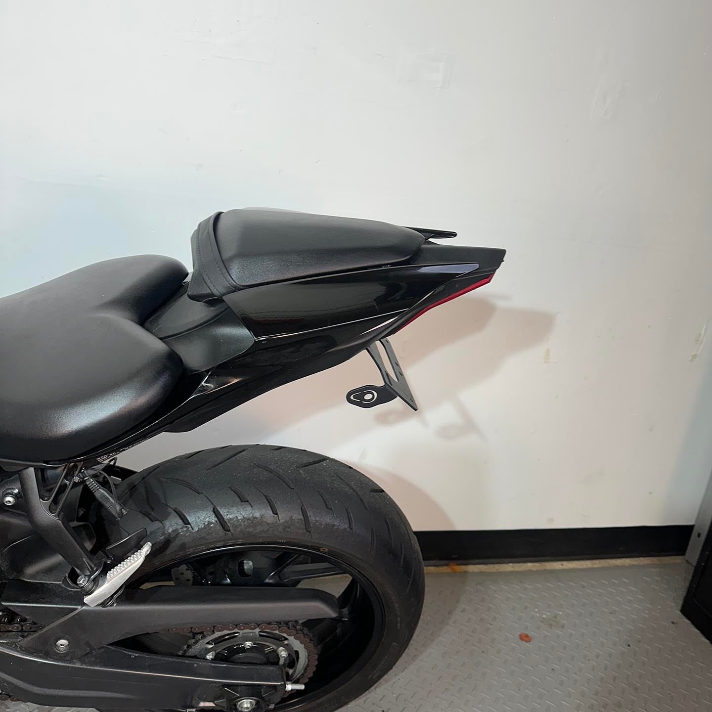This specific motorcycle has been upgraded with a full M4 exhaust system, TST Industries Halo flush mount front turn signals, VF Designs integrated rear turn signals, and a fender eliminator/tail tidy kit.