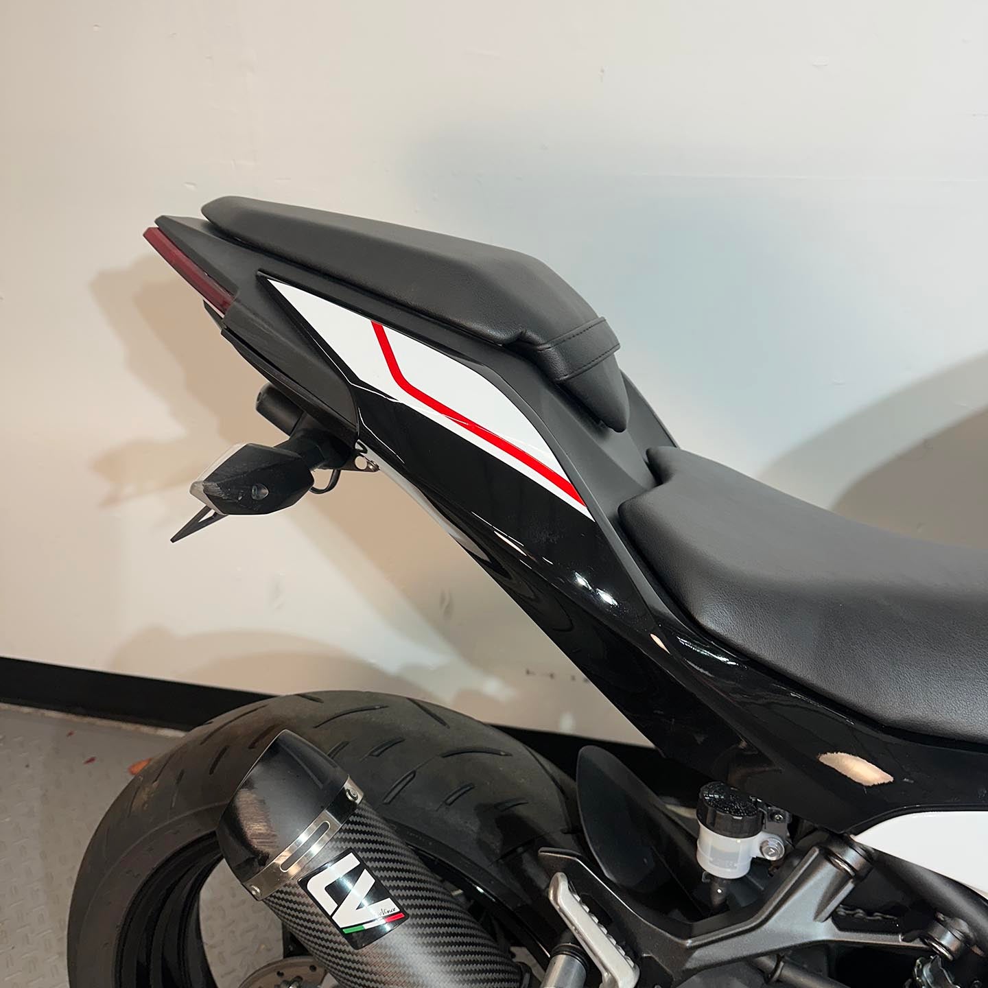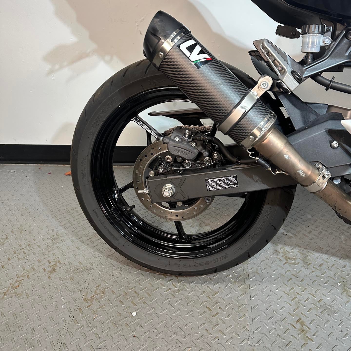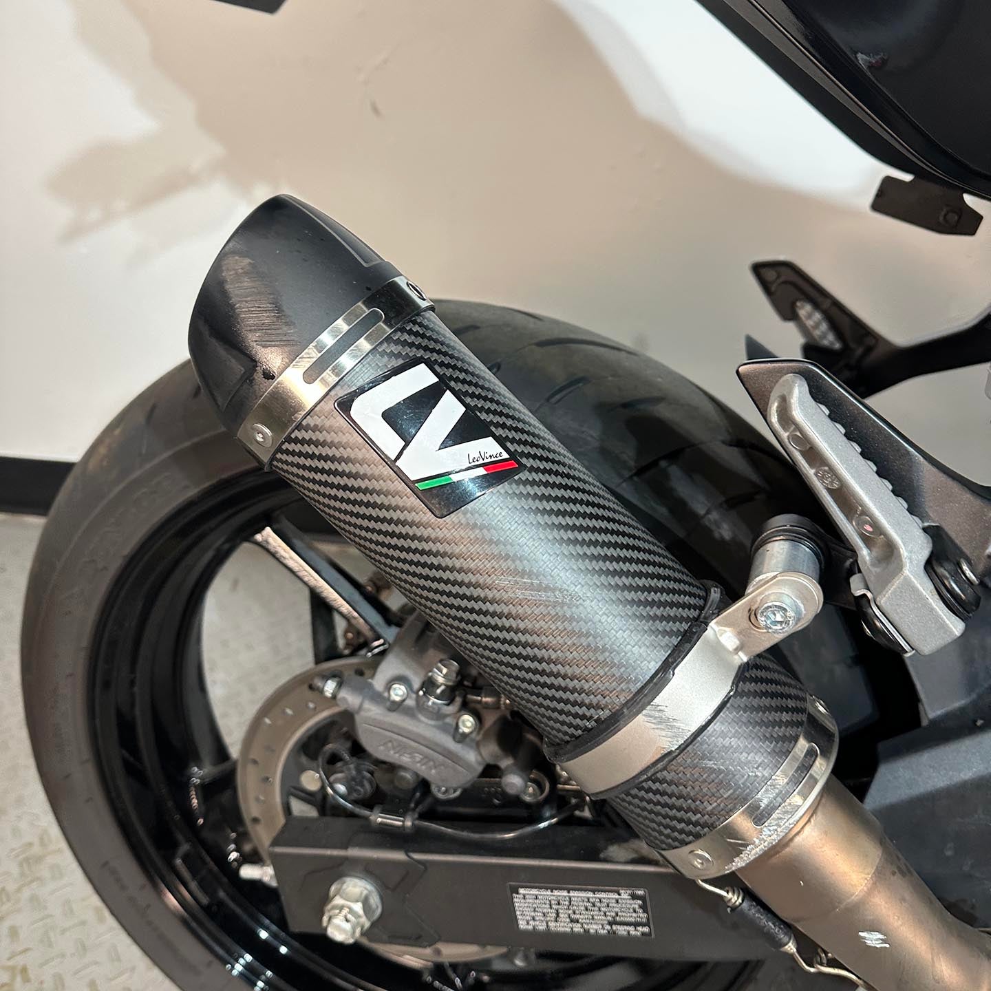 This specific motorcycle has a Leo Vince slip on exhaust system, GB Racing engine protector covers, a fender eliminator/tail tidy kit and as ASV clutch lever. \