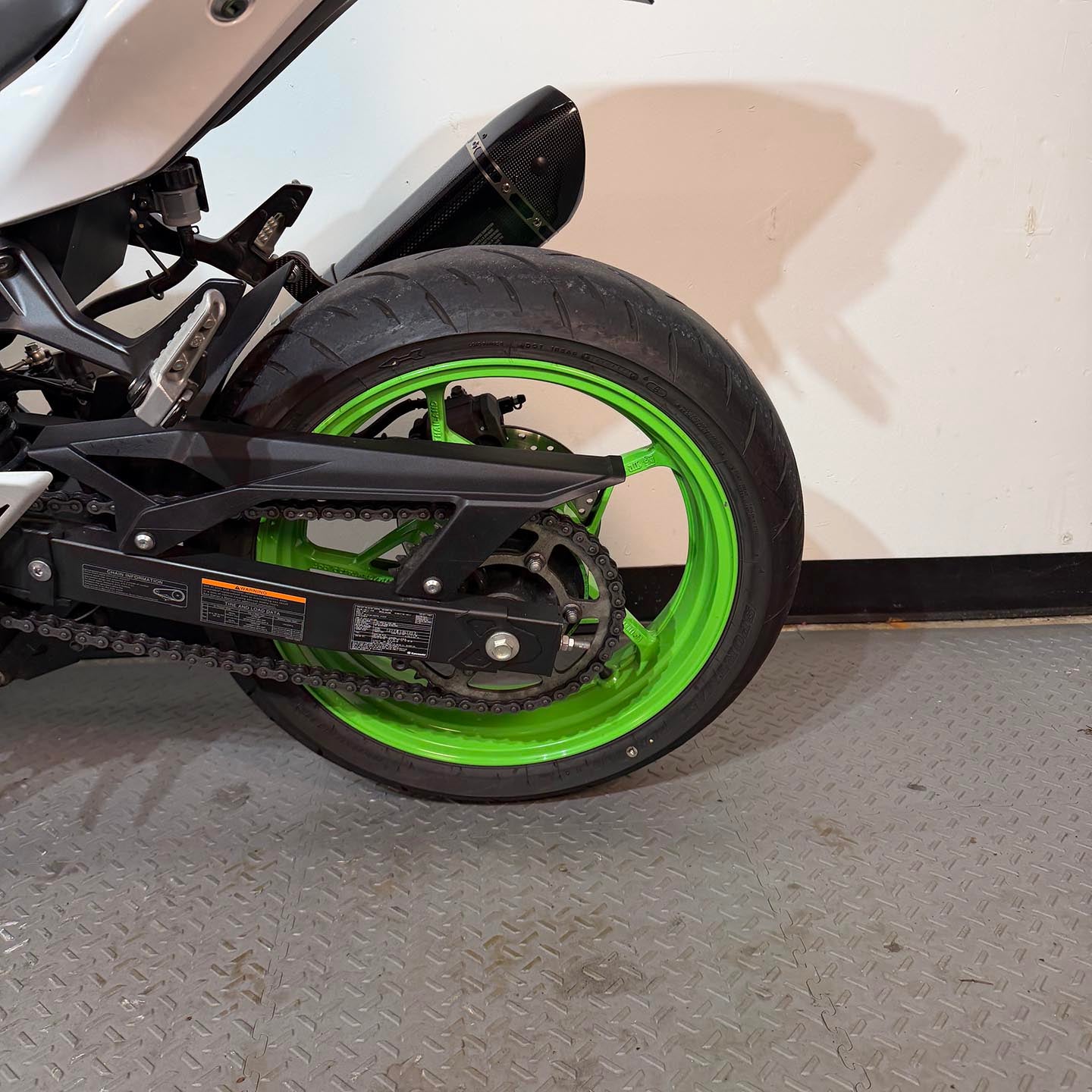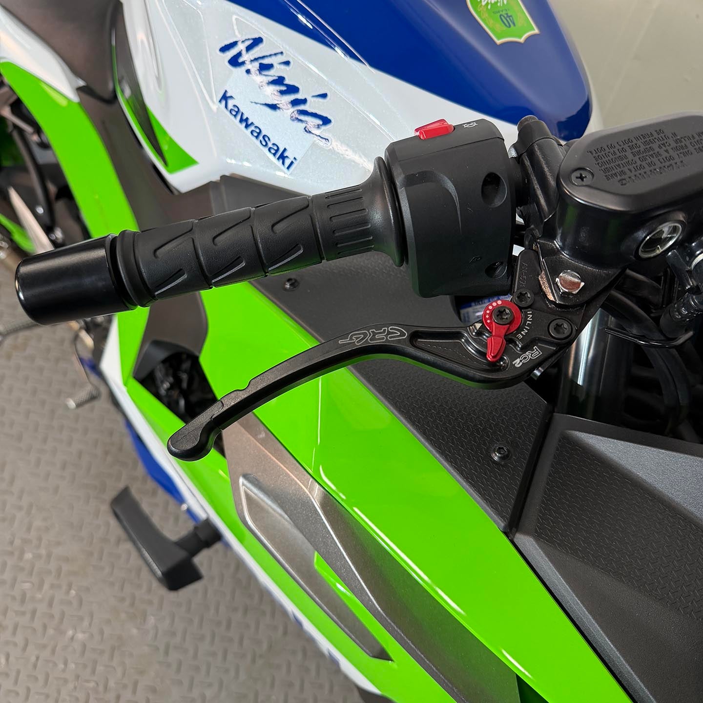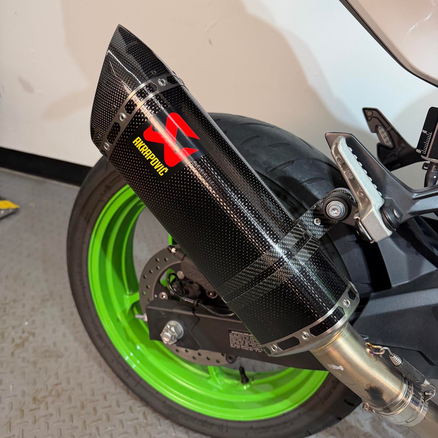 This specific motorcycle has a carbon fiber Akrapovic slip on exhaust installed. CRG adjustable levers have been fitted and a fender eliminator kit/tail tidy installed.