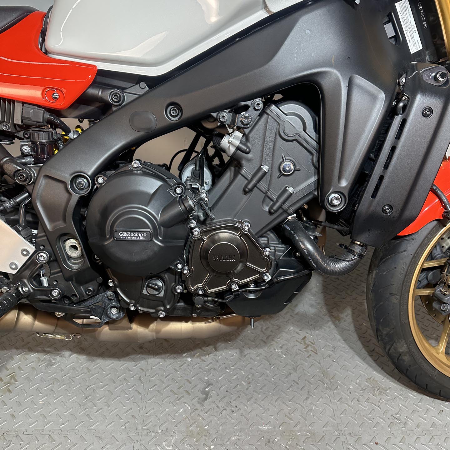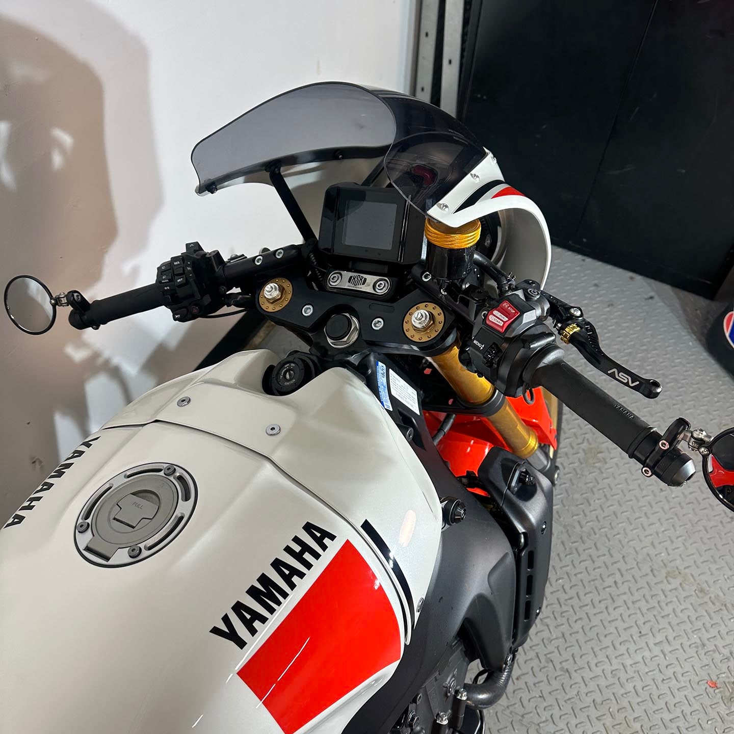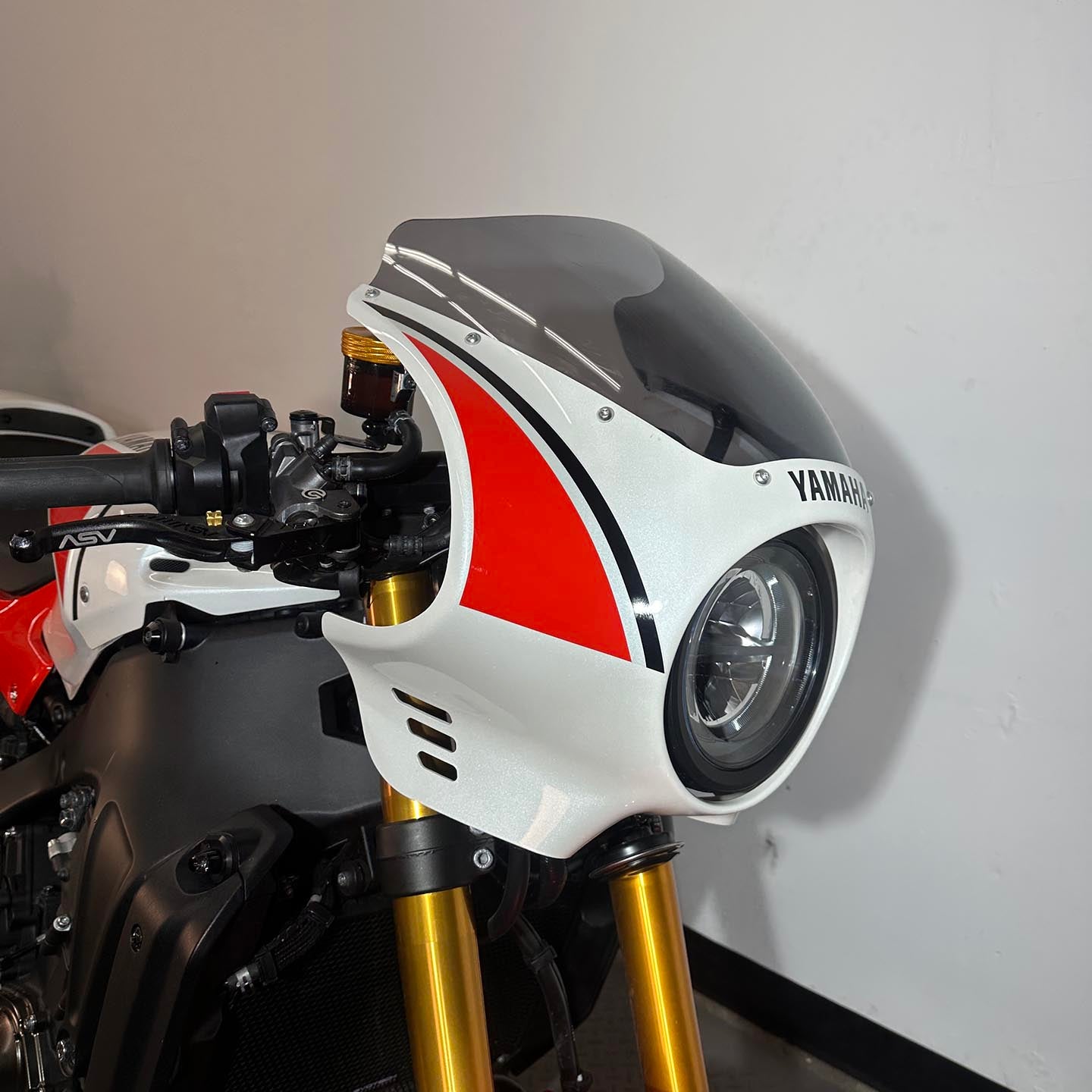 This specific motorcycle has many premium modifications installed. A full Kelpi stainless exhaust system is mounted up. Yamaha accessory upper fairing and tail fairing are installed. These parts are only available through Yamaha EU and are extremely difficulty to source (rare). S2 Concept clip on handlebars are installed with Yamaha accessory heated grips. ASV levers are installed along with a matching Sato brake reservoir cap. CRG folding bar end mirrors are installed. The front turn signals have been replaced with Motogadget Mblaze micro led unit (super bright). A GB Racing clutch cover protector is installed. A fender eliminator kit/tail tidy is installed.