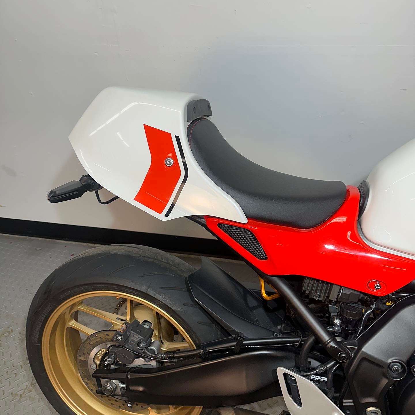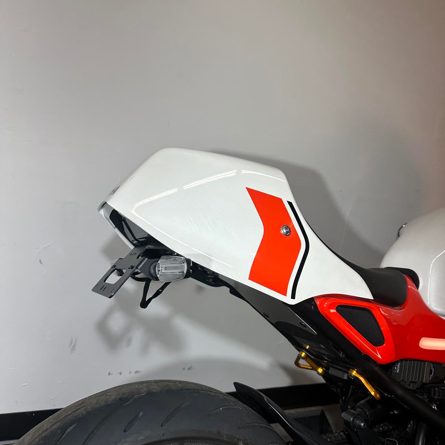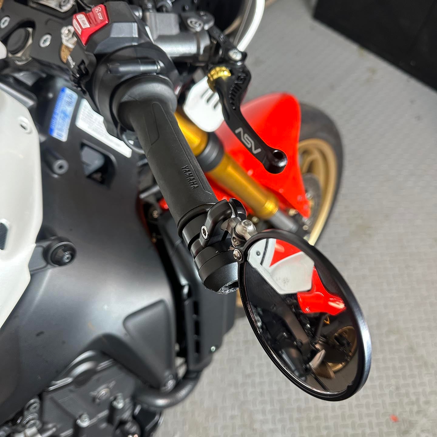 This specific motorcycle has many premium modifications installed. A full Kelpi stainless exhaust system is mounted up. Yamaha accessory upper fairing and tail fairing are installed. These parts are only available through Yamaha EU and are extremely difficulty to source (rare). S2 Concept clip on handlebars are installed with Yamaha accessory heated grips. ASV levers are installed along with a matching Sato brake reservoir cap. CRG folding bar end mirrors are installed. The front turn signals have been replaced with Motogadget Mblaze micro led unit (super bright). A GB Racing clutch cover protector is installed. A fender eliminator kit/tail tidy is installed.