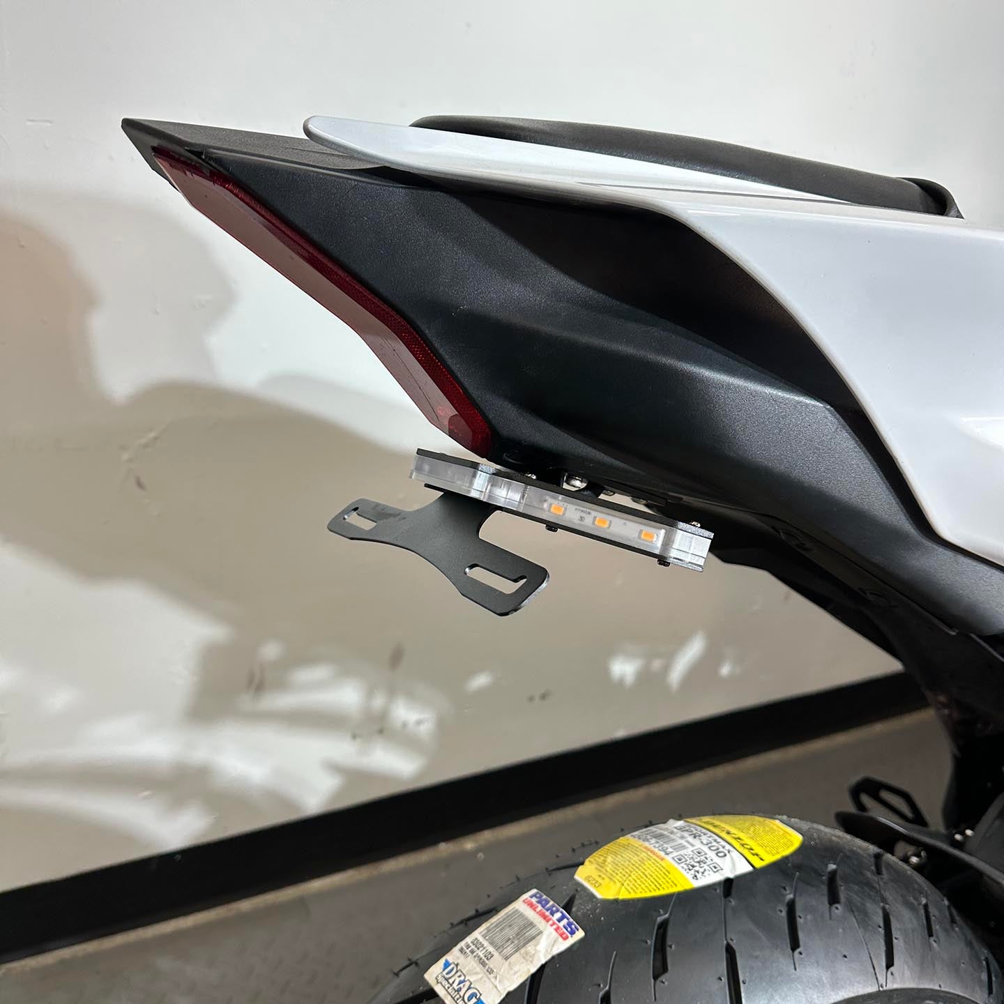 This specific motorcycle has a billet aluminum machined top triple clamp, flush mount front led turn signals and a fender eliminator kit/tail tidy installed.